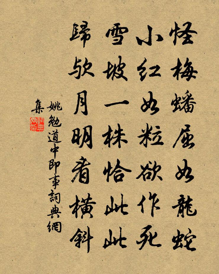 怪梅蟠屈如龙蛇,小红如粒欲作死。雪坡一株恰此此,归欤月明看横斜。
