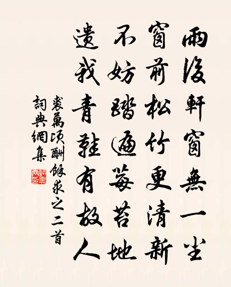 雨后轩窗无一尘,窗前松竹更清新。不妨踏遍莓苔地,遗我青鞋有故人。